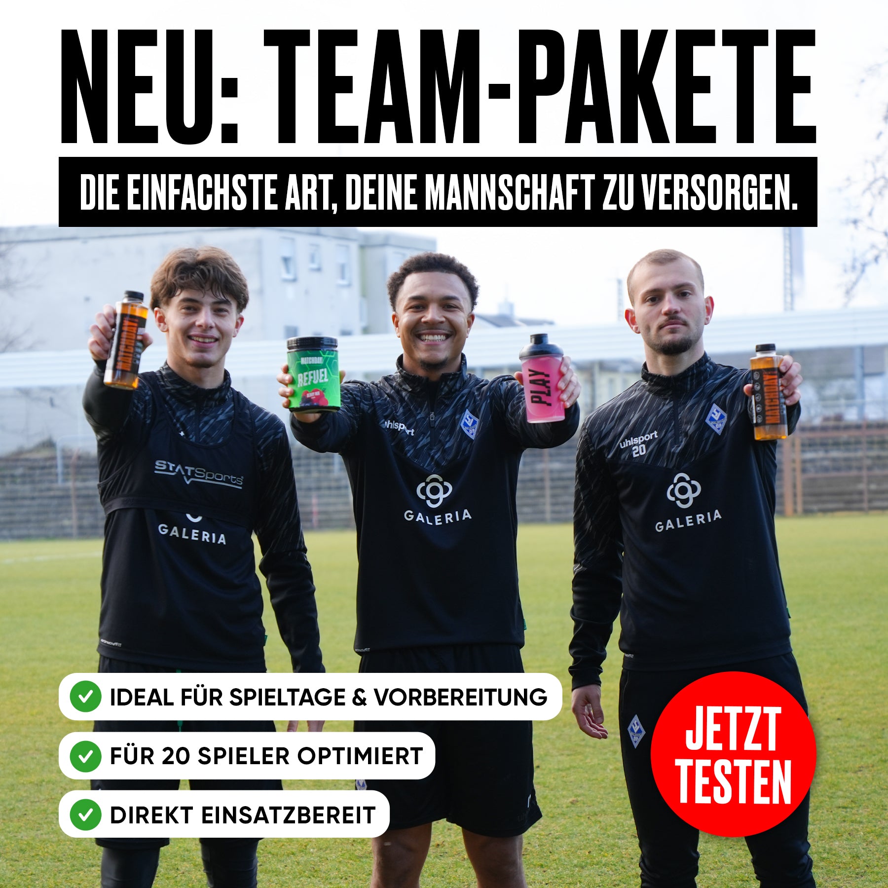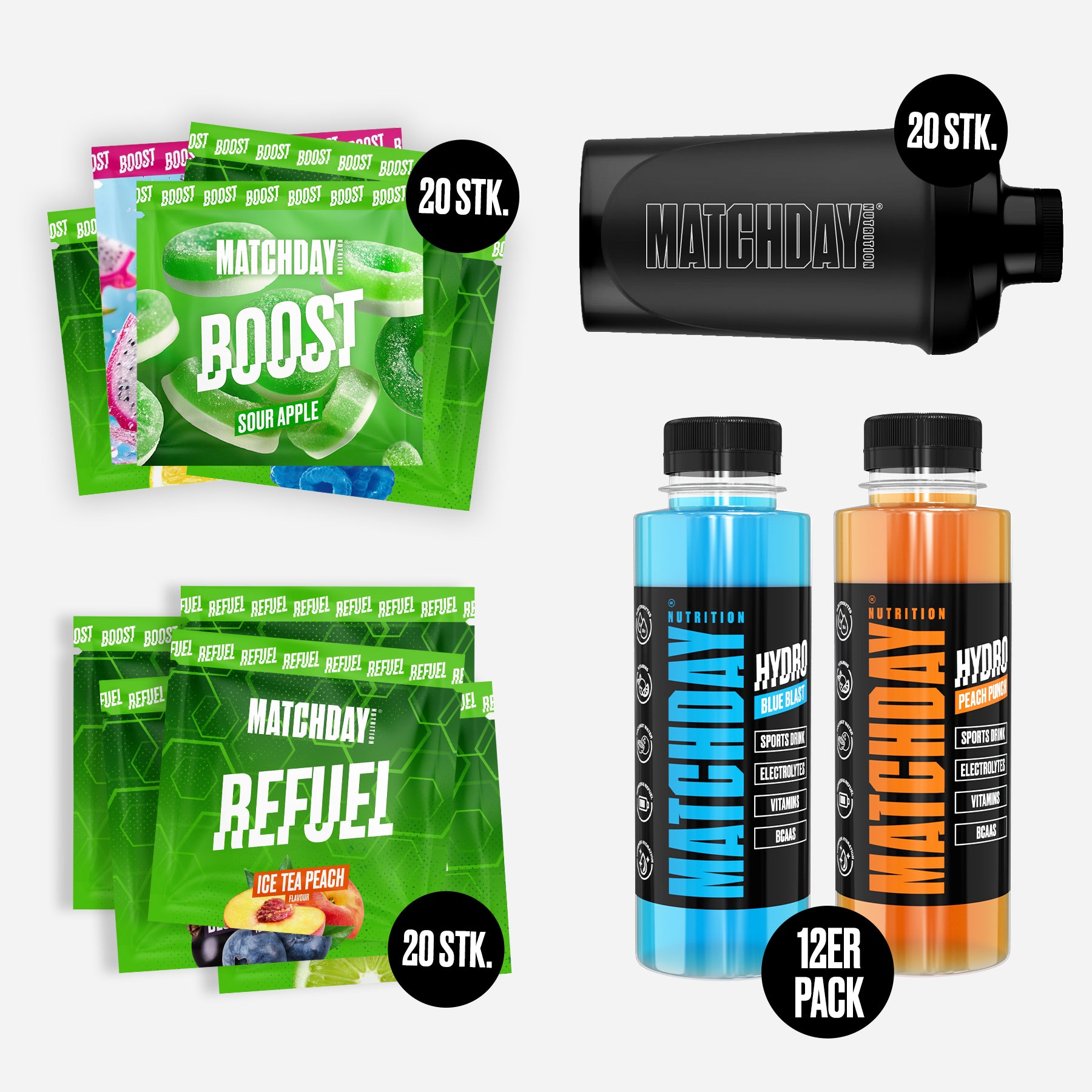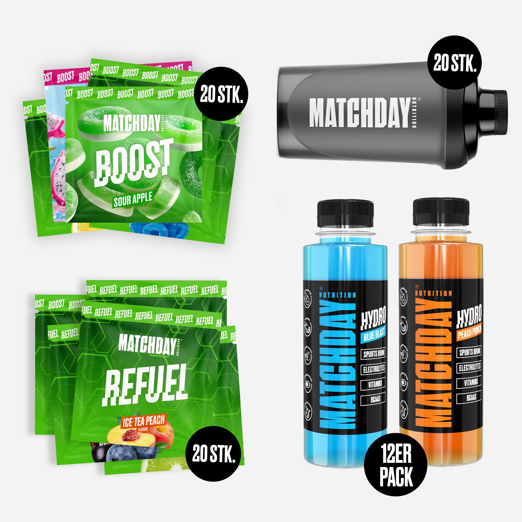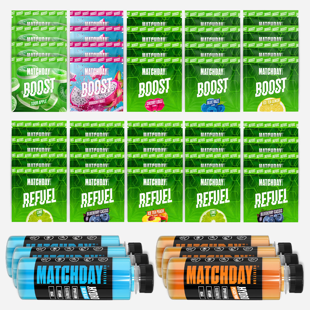 Es sind insgesamt 20x BOOST Sachets (Einmalportionen) enthalten, 20x REFUEL Sachets (EInmalportionen) und 12x 500ml Flaschen von unserem HYDRO Sports Drink. So kann kann jeder Spieler in der Mannschaft die Produkte probieren und ihr könnt eure Favoriten finden!