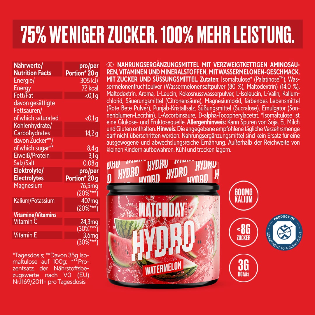 Isomaltulose*, Wassermelonenfruchtpulver (Wassermelonensaftpulver (80 %), Maltodextrin) (14.0 %), Kokosnusswasserpulver, L-Leucin, Säuerungsmittel (Citronensäure), Kaliumchlorid, Aroma, L-Isoleucin, L-Valin, Magnesiumoxid, Maltodextrin, färbendes Lebensmittel (Rote Bete Pulver, Konzentrat aus Saflor), Himalaya-Salz, Emulgator (Sonnenblumen-Lecithin), L-Ascorbinsäure, Süßungsmittel (Sucralose), D-alpha-Tocopherylacetat