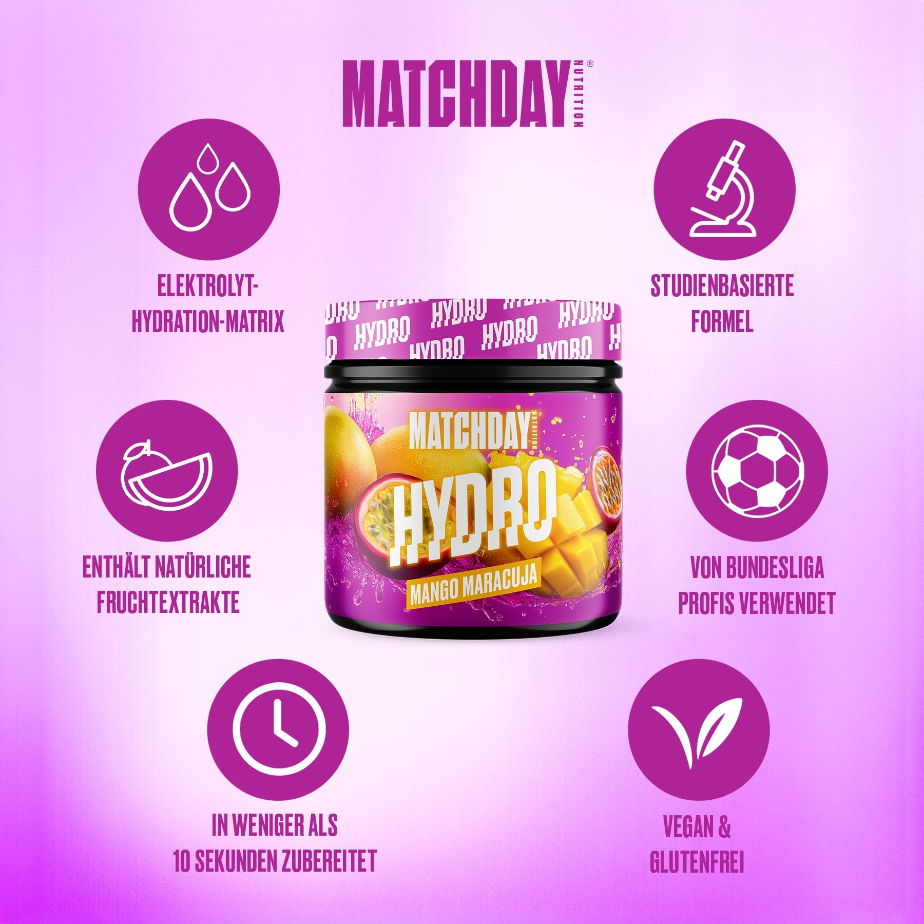 20g Pulver (1 Messlöffel) in 600ml Wasser (MATCHDAY Trinkflasche) auflösen und während dem Training und Spiel oder in der Halbzeitpause trinken.