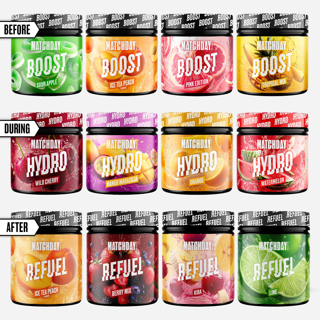 Dieses Paket enthält insgesamt 4 Dosen BOOST (Before), 4 Dosen HYDRO (During) und 4 Dosen REFUEL (After). Mit diesem Paket ist eure Mannschaft komplett abgedeckt für alle Phasen des Spiels. Das Paket enthält insgesamt 240 Portionen und sollte im Schnitt dann 4-6 Spieltage reichen.